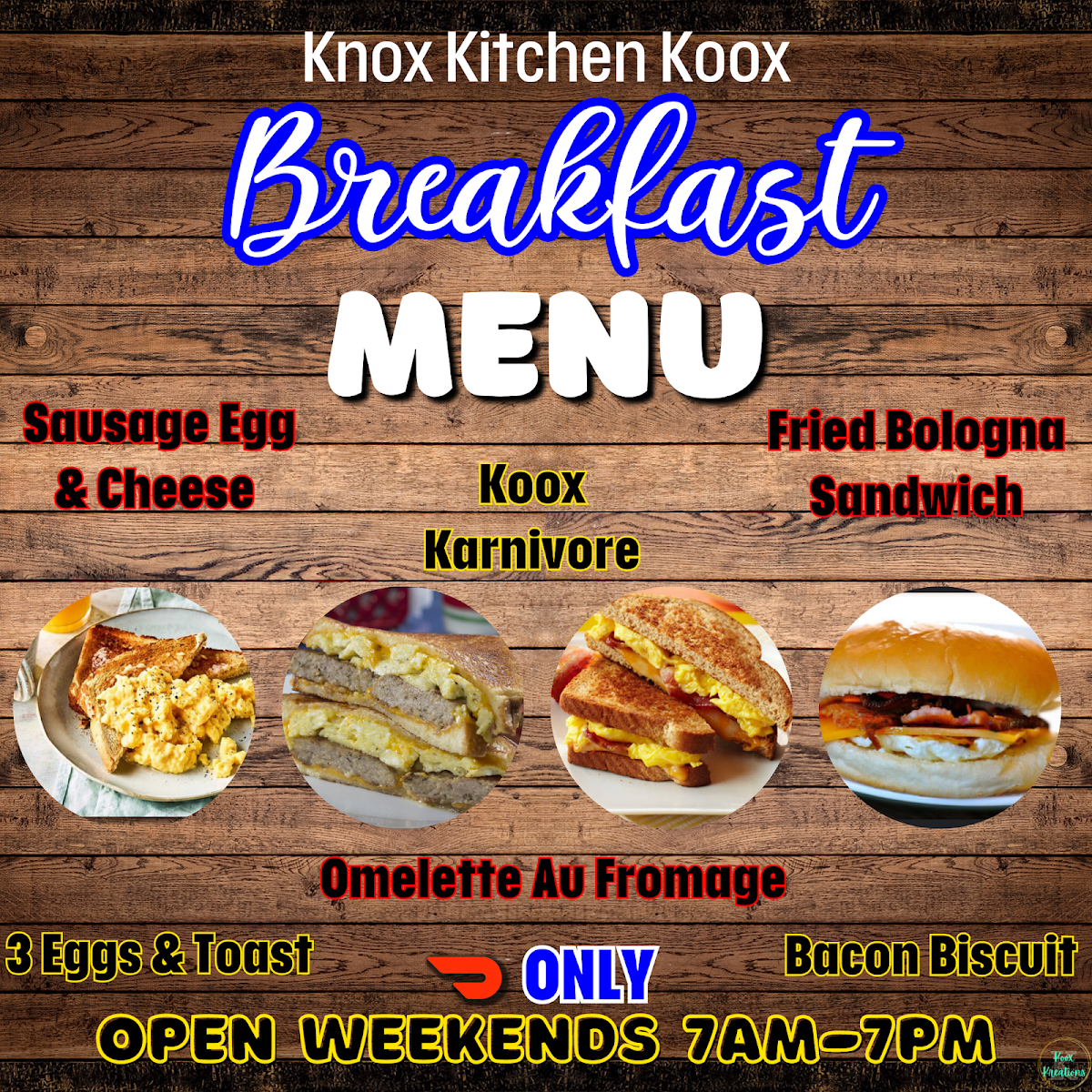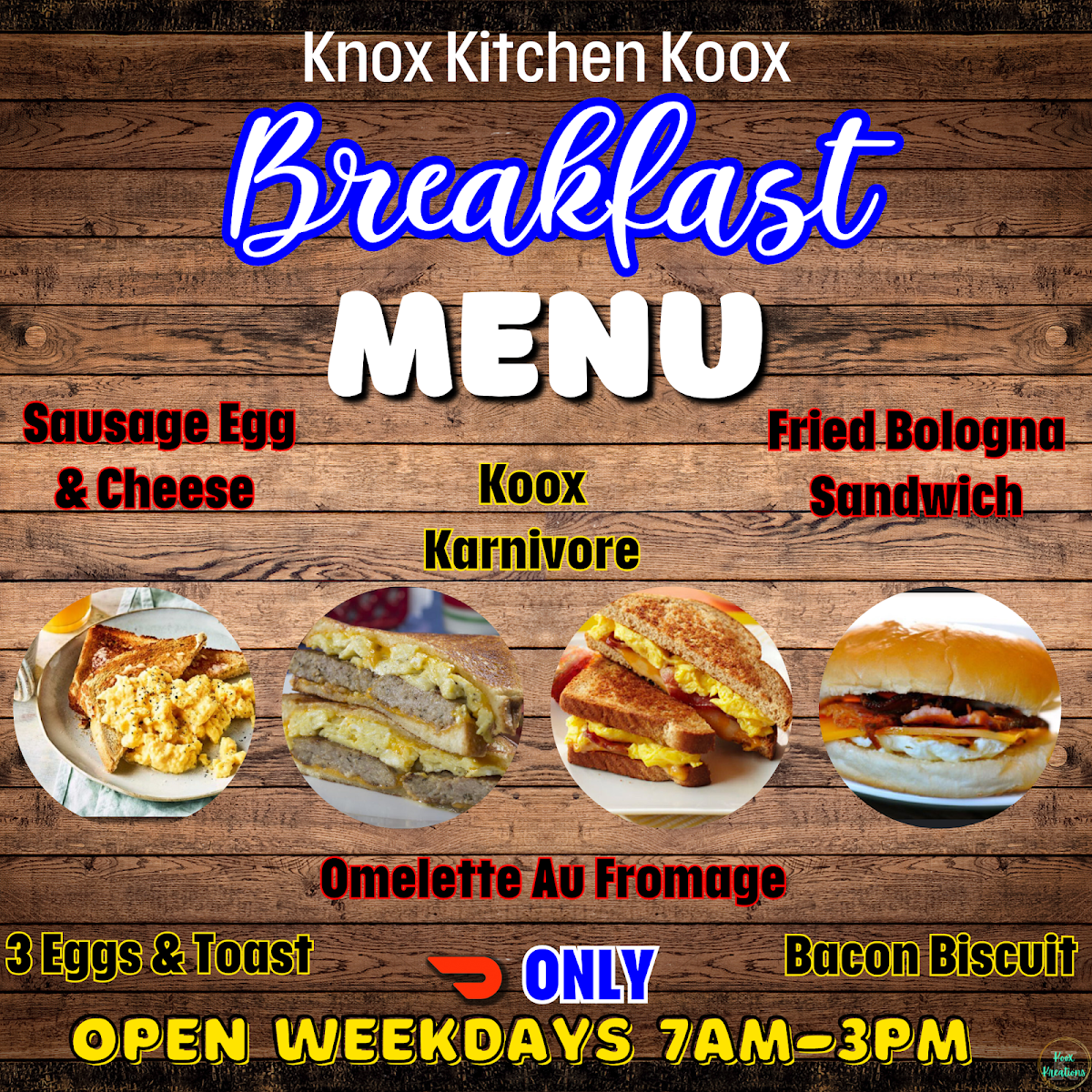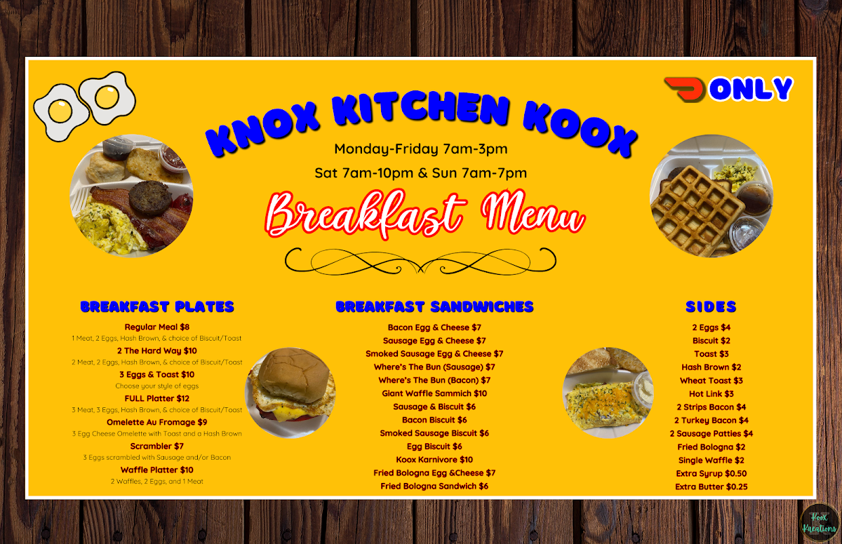 The Knox Kitchen Koox Menu is a deliciously bold expression of classic American comfort food with an edge of creativity that truly sets it apart. Located in Memphis, this local gem doesn’t just feed your cravings-it delivers an experience built on hearty flavors, rich textures, and a menu that knows how to satisfy from morning to night. For burger lovers, the lineup is seriously stacked. Whether you're digging into a Double Bacon Cheeseburger, going all out with the Triple Burger, or keeping things simple yet satisfying with the Single Burger, each option is crafted to pack a punch. The Double Burger and Bacon Cheese Burger are crowd favorites, bringing that juicy, grilled goodness that hits just right.