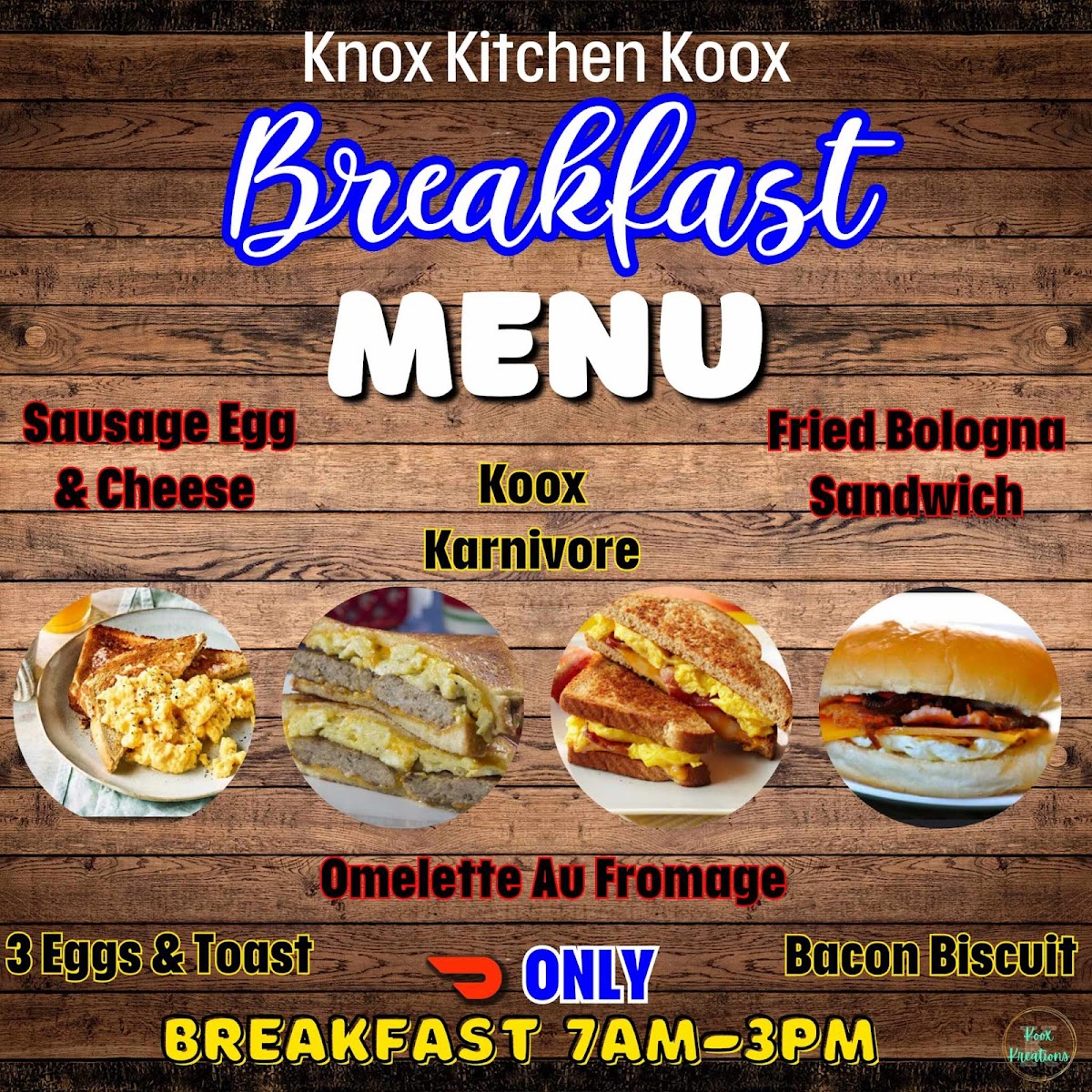 But it’s not just lunch that shines-breakfast at Knox Kitchen Koox is equally impressive. The FULL Platter delivers a complete start to the day, while options like 2 The Hard Way, Regular Meal, and Scrambler offer variety for different morning moods. The Omelette Au Fromage is a standout for cheese lovers, adding a touch of indulgence to the early hours. Breakfast sandwich lovers will find plenty to love too, with highlights like the Bacon Egg & Cheese, Sausage Egg & Cheese, and the protein-packed Koox Karnivore. For a Southern twist, the Fried Bologna E&C Sandwich brings a nostalgic, savory experience that feels both familiar and exciting.